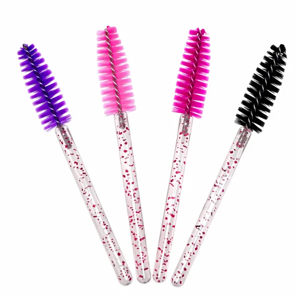 Cepillos desechables ideales para el cuidado, peinado y mantenimiento de pestañas y cejas. Su diseño con mango acrílico morado escarchado brinda un aspecto elegante y profesional, perfecto para uso en salones de belleza, estéticas o para uso personal.