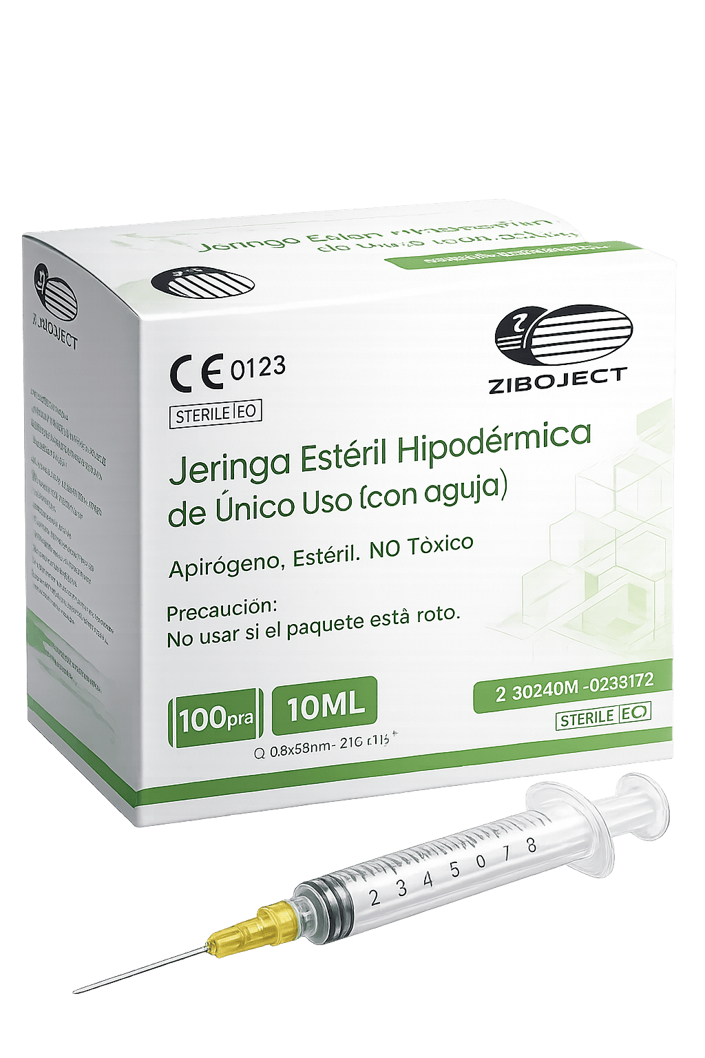 La jeringa hipodérmica de 10 ml con aguja 21G x 1 1/2” es un insumo médico estéril y desechable, ideal para la administración de medicamentos y extracción de fluidos de forma segura y precisa.