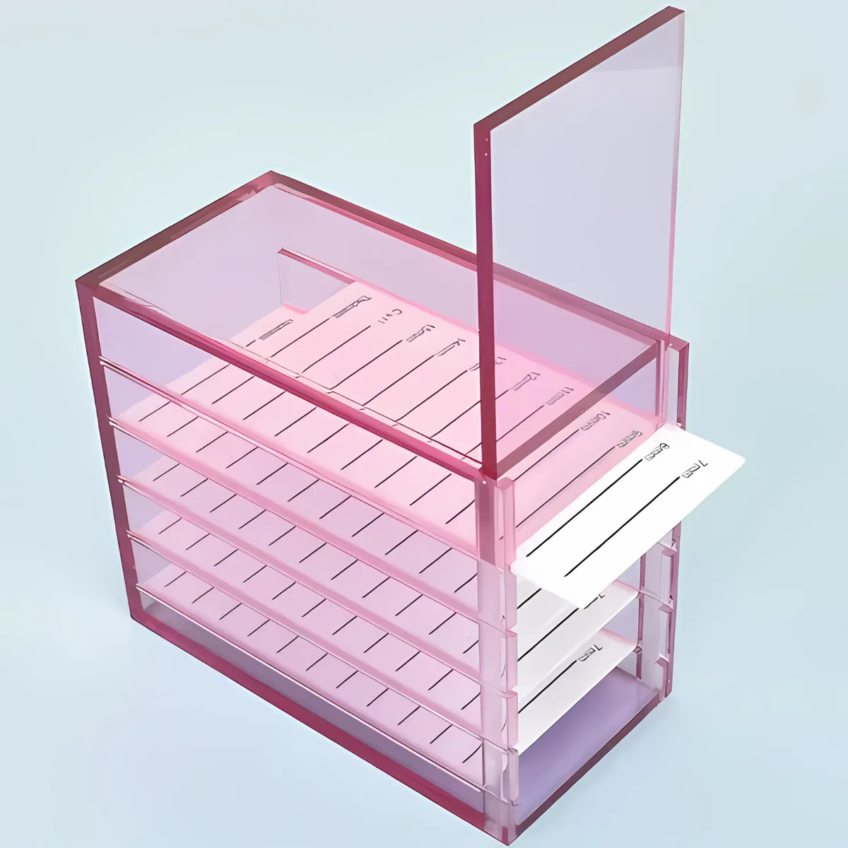 Diseño de 5 capas, gran capacidad y útil. Perfecto para guardar tus pestañas y herramientas, mantente libre de polvo. Hecho de acrílico de alta calidad, fácil de limpiar, duradero y estable.