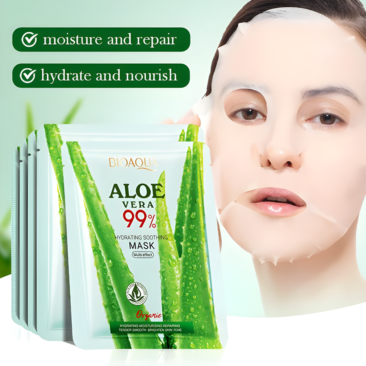 El Velo Facial de Aloe Vera 99% de Bioaqua está formulado con extracto natural de sábila para ofrecer una hidratación profunda y efecto calmante inmediato. Su textura ligera y fresca ayuda a revitalizar la piel, especialmente después de la exposición solar o de agentes externos. Ideal para todo tipo de piel, incluyendo las más sensibles, ya que aporta suavidad, frescura y una sensación de confort instantáneo.