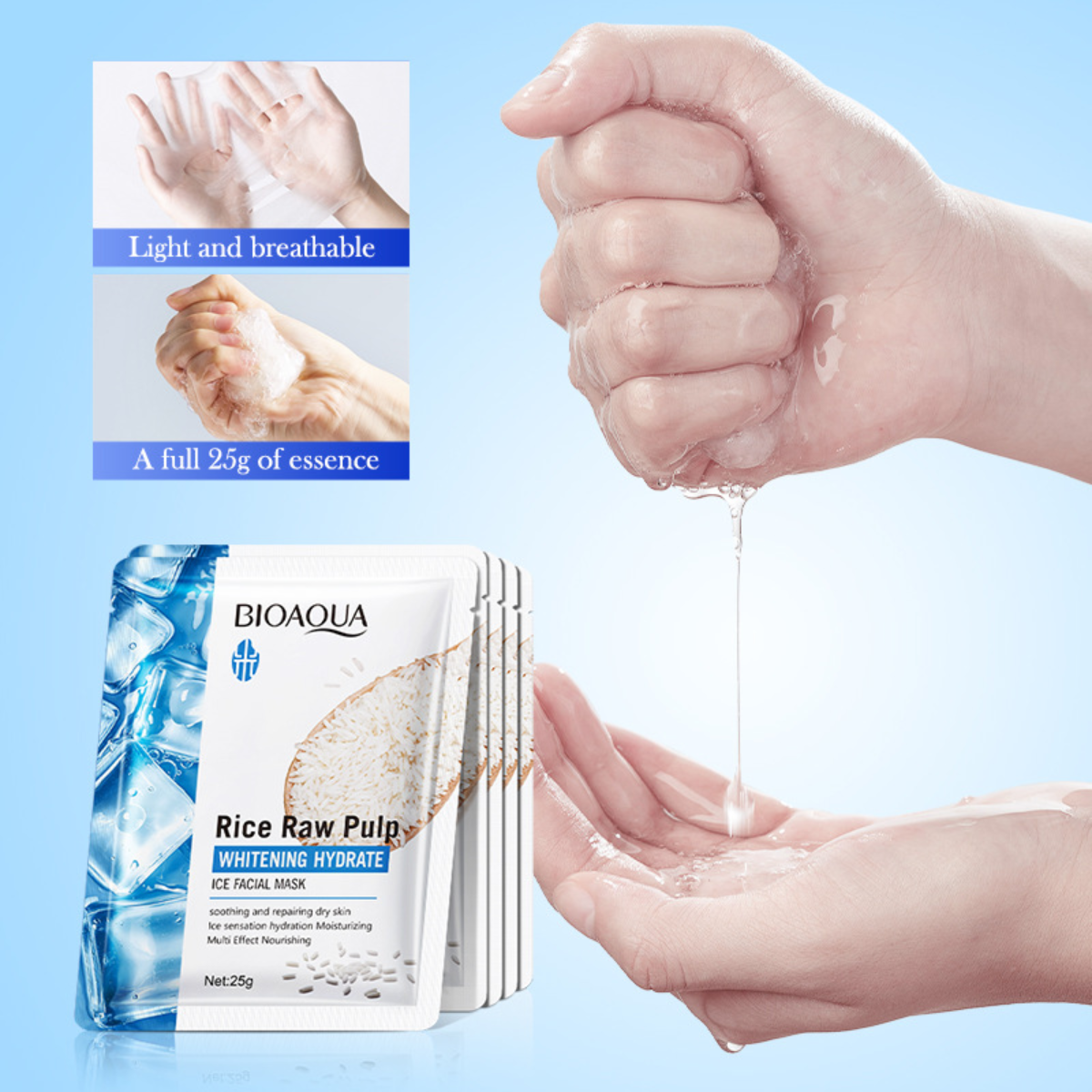 La mascarilla de arroz realiza una hidratación profunda y duradera, aliviando la sequedad y nutriendo la piel además, las propiedades del arroz logran mantener un tono de piel uniforme, combatiendo las manchas y emparejando el tono natural de la piel; Este producto se enfoca en hidratar la piel seca, controlar el exceso de aceite y minimizar los poros